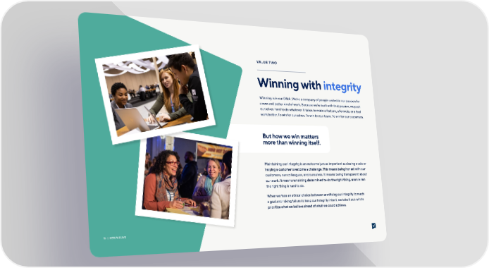 VALUE TWO Winning with integrity Winning is in our DNA. We’re a company of people united in our passion for a new and better kind of work. Because we’re built with that passion, we push ourselves hard to do whatever it takes to make a feature, a formula, or a tool work better. To win for ourselves. To win for our team. To win for our customers. But how we win matters more than winning itself. Maintaining our integrity is an outcome just as important as closing a sale or helping a customer overcome a challenge. This means being honest with our customers, our colleagues, and ourselves. It means being transparent about our work. It means remaining determined to do the right thing, even when the right thing is hard to do. When we face an ethical choice between sacri昀椀cing our integrity to reach a goal and risking failure to keep our integrity intact, we take it as a win to prioritize what we believe ahead of what we could achieve. | 16 HOW WE LIVE