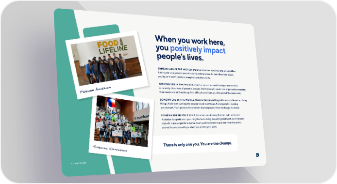 When you work here, you positively impact people’s lives. SOMEWHERE IN THE WORLD, there’s a voracious mind working on a problem. A rising star at a global brand. A budding entrepreneur. As their ideas take shape, you’ll give them the tools to bring their solutions to life. SOMEWHERE IN THE WORLD, there’s someone in need. A refugee from conflict g America or calamity. A survivor of personal tragedy. You’ll work with passionate organizations meeting Feedin their needs, and as they rise up from di昀케cult conditions, you’ll be part of the reason why. SOMEWHERE IN THE WORLD, there’s a visionary setting out to accomplish extraordinary things. A scientist pushing the boundaries of knowledge. A changemaker building a movement. You’ll provide the platform that empowers them to change the world. SOMEWHERE IN YOUR MIND, there’s an idea forming that can make an impact. A solution to a problem in your neighborhood. A big idea with global reach. An innovation that will make our platform better. You’ll use Smartsheet to put your ideas into action, and we’ll celebrate with you when you achieve your goals. Spe There is only one you. You are the change. cial Ol ympics | 9 WHO WE ARE