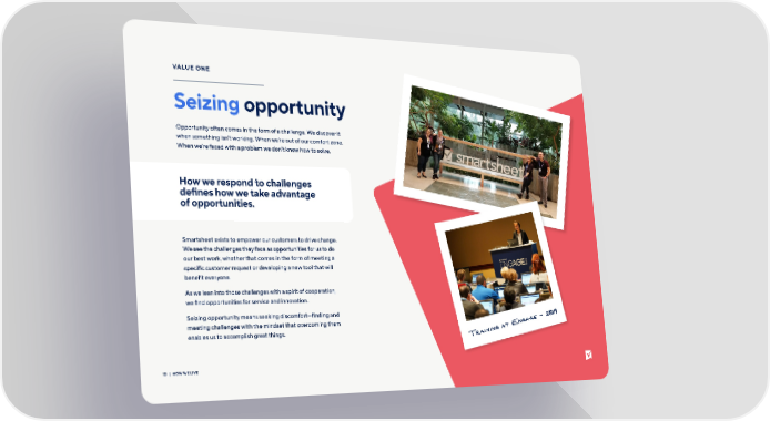 VALUE ONE Seizing opportunity Opportunity often comes in the form of a challenge. We discover it when something isn’t working. When we’re out of our comfort zone. When we’re faced with a problem we don’t know how to solve. How we respond to challenges de昀椀nes how we take advantage of opportunities. Smartsheet exists to empower our customers to drive change. We see the challenges they face as opportunities for us to do our best work, whether that comes in the form of meeting a speci昀椀c customer request or developing a new tool that will bene昀椀t everyone. As we lean into those challenges with a spirit of cooperation, we 昀椀nd opportunities for service and innovation. Seizing opportunity means seeking discomfort—昀椀nding and 1199 meeting challenges with the mindset that overcoming them ngage - 2020 t E enables us to accomplish great things. raining a T | 15 HOW WE LIVE