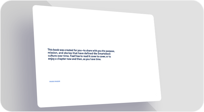 We founded Smartsheet with a vision of empowering the individual to innovate and act on their recommendations. It’s our guiding light for everyone who works here: Make your work meaningful, and enrich our company with your ideas. This book was created for you—to share with you the purpose, mission, and stories that have defined the Smartsheet culture over time. Feel free to read it cover to cover, or to enjoy a chapter now and then, as you have time. We hope it will help you understand who we are and where we came from— and to empower you as an individual to create an exciting future here. MARK MADER CEO, Smartsheet
