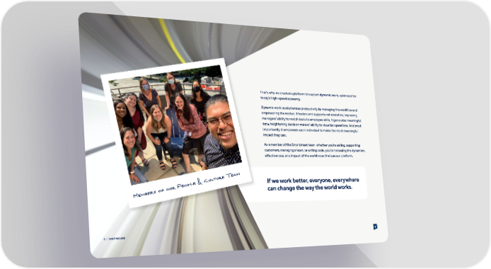 That’s why we created a platform to support dynamic work, optimized for today’s high-speed economy. Dynamic work revolutionizes productivity by managing the workflow and empowering the worker. It fosters and supports collaboration, improving managers’ ability to match tasks to employee skills. It generates meaningful data, heightening decision makers’ ability to visualize operations. And most importantly, it empowers each individual to make the most meaningful impact they can. As a member of the Smartsheet team, whether you’re selling, supporting customers, managing a team, or writing code, you’re increasing the dynamism, e昀昀ectiveness, and impact of the workforces that use our platform. am e e T tur ople & Cul If we work better, everyone, everywhere e s of our P can change the way the world works. Member | 8 WHO WE ARE